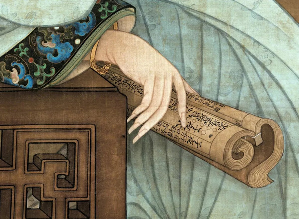 而衣褶中似有似无的暗影,无疑是欧洲绘画技法的体现。凝脂般的双手与细致入微的书卷无不显露着细腻的立体效果,竟于局部细节中引人联想到西方学院派画作中描绘的名门贵族之女。