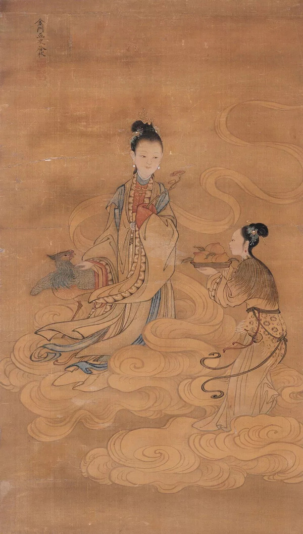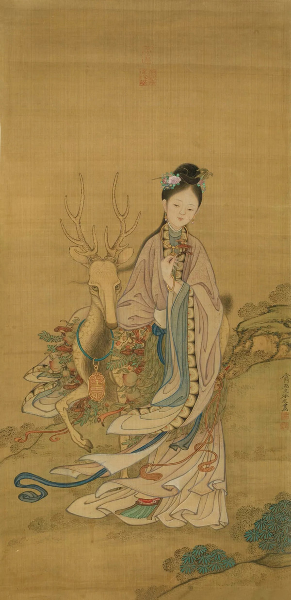 雍正九年,冷枚为其大寿绘制了一幅《献寿图》,此画堪称冷枚仕女画的代表之作。画中麻姑仙女,身材修长且亭亭玉立,竹篮中的牡丹及仙草野卉被其刻画得生动传神。精致的勾勒与立体结构的把握,使得画面风格在传统与西方间游离不定。