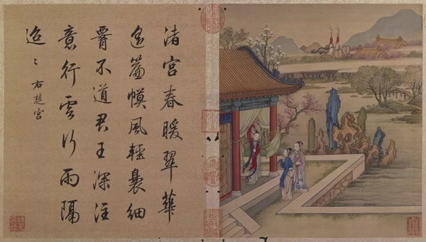 而说到文字,便不得不提到冷枚的《十宫词图》。其中描绘了历代贤德后妃或贵族女子的故事,人物画风工整,对题有梁诗正书写的弘历承继帝位前于雍正十三年(1735年)所作的诗句,与图画互为辉映。