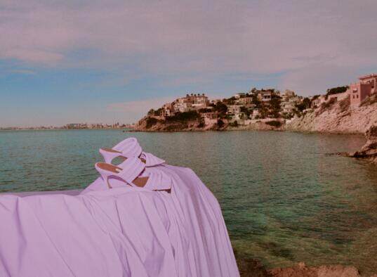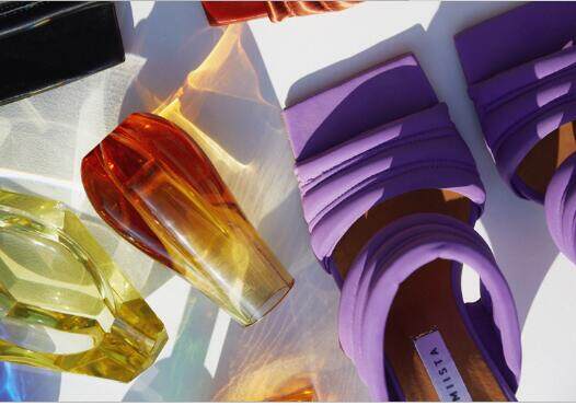 本季我们探索了许多不寻常的材质和结构,春季Frostine紫⾊凉鞋上使⽤的莱卡材质,在不同光线下呈紫⾊或是粉红⾊。