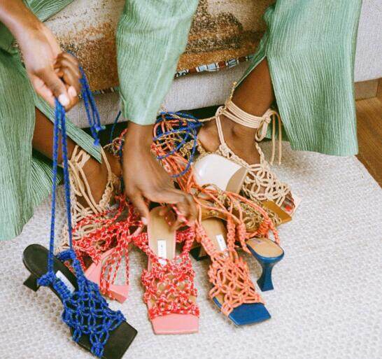 Annie凉鞋以登⼭绳制成,极细的鞋跟包覆了纳帕⽺⽪⾰。