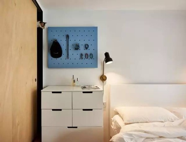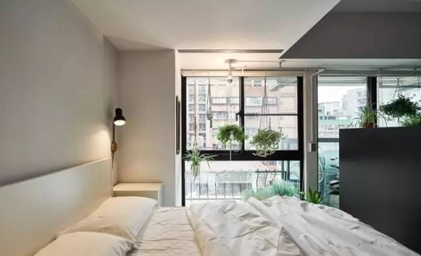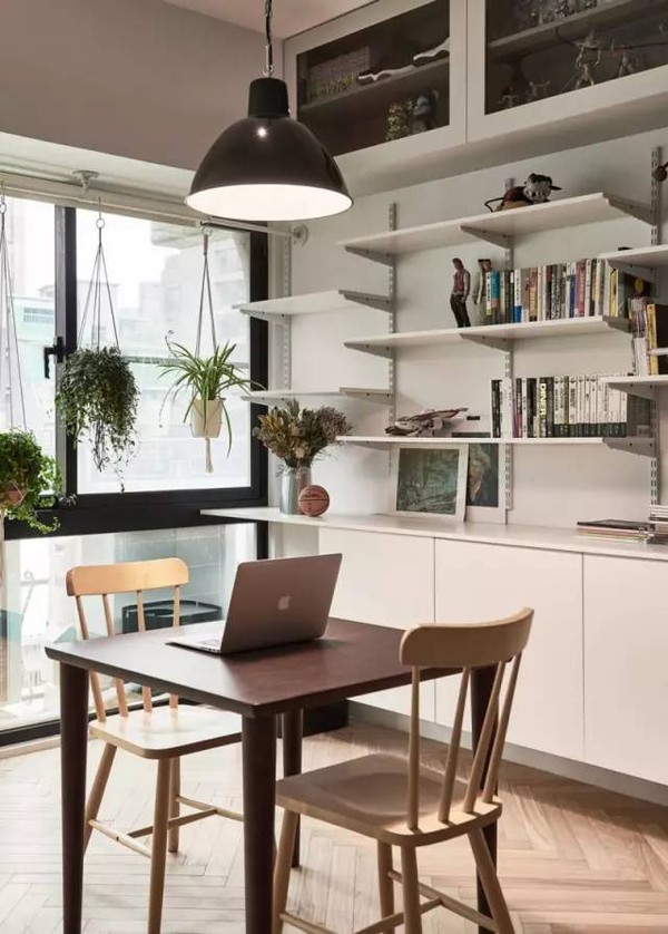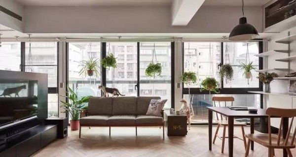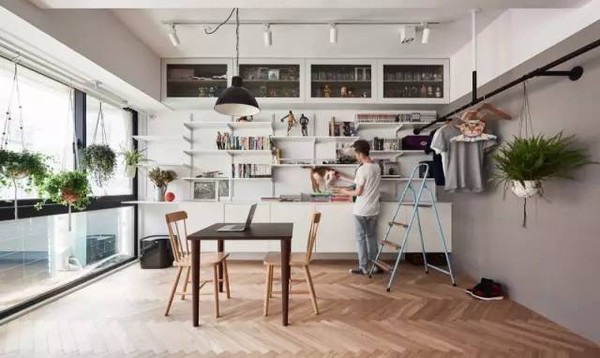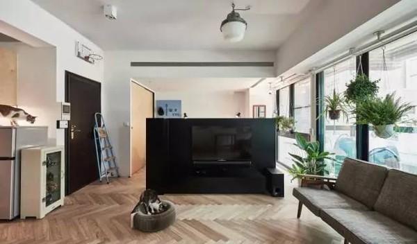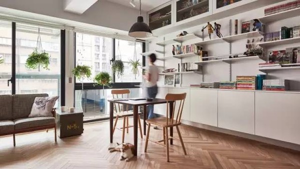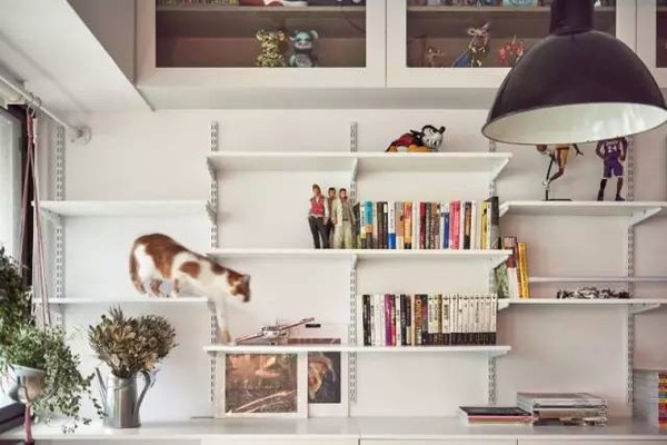 业主要求设计师整合一个空间,放置他的书籍和收藏品,同时光线的引入、绿植和不同高度的长条搁置板,使45㎡的单身公寓也更适合两只猫玩耍