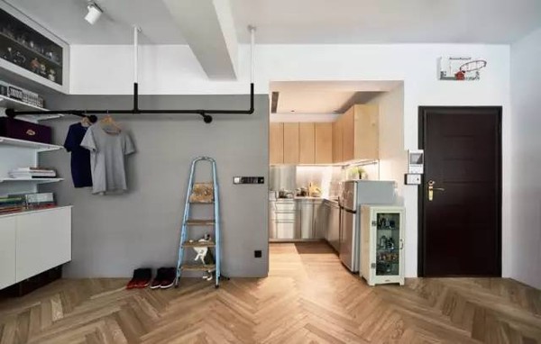 厨房、客厅、卧室和储藏室之间的墙被拆除,创造了一个开放空间,新的起居室和卧室之间的低分隔间产生了类似阁楼的效果,这允许一些隐私,但也让光线流经公寓