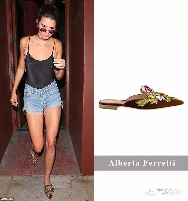 如果在来点刺绣那就更复古,Kendall穿吊带短裤配拖鞋,有了天鹅绒和刺绣,整个造型都变得精致了
