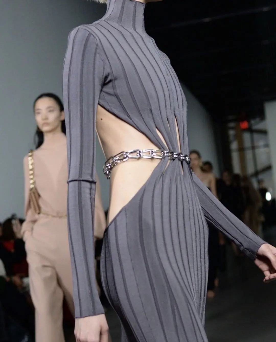 同样2020秋冬系列中的这款,通过收腰处理极大地修饰和突显出女性性感魅力的同时,加上一个冰冷的链条去中和过度感,所以即使是大露背设计也不会觉得有过分的压力感。