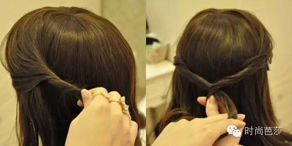 Step1 取出额边一部分头发,顺时针拧转。不用太大力哦,松散自然看起来才毫不费力。