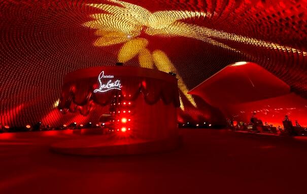 空间中央的圆形舞台与建筑结构相得益彰。舞台以透明银色幕布遮蔽,灯光从地面延伸而出,光影之间更显简约纯白场景的别样魅力。舞台四周设有圆柱形座位,与红色地板交相辉映,向Christian Louboutin奇妙艺术世界中最具标志性的一抹红色致敬。