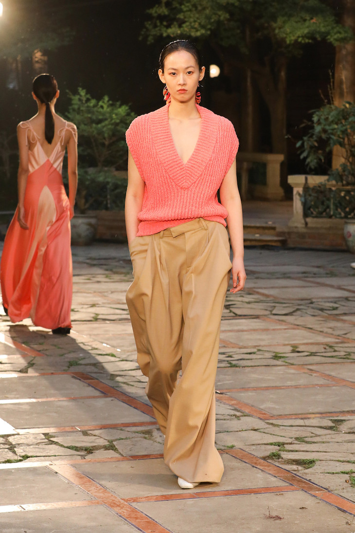面料运用上,SAMUEL GUÌ YANG本季选用日本奥司维(Ultrasuede)公司的人造绒面革,配以绒面革短款双排扣风衣配民族风宽袖等单品,为新品系列增添雕塑元素。源于英国的Fox Brothers硬挺感羊毛或松软绵实的斜纹面料,则透过略大的廓形剪裁体现出品牌特有的利落气息。而首次引入以小型针织程序精心制作甄选的回收纱线,则以方领连衣裙与蜜桃粉色V领背心呈现,在细节中实现可持续时尚的新理念。