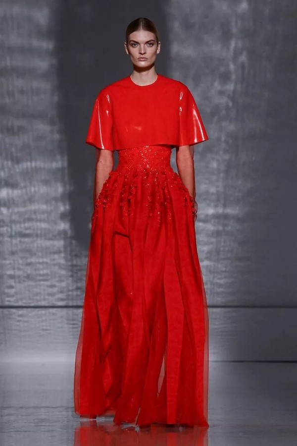 Waight Keller是女性设计师中少有的存在,之所以她的设计优雅又独具当代气质,就是因为Waight Keller骨子里的男性思维(别忘了她之前还是一名男装设计师)与一股英国女人天生的酷劲儿。乳胶是本季高定的重要突破口之一,它闪亮又贴合的特性给予了那些柔美的裙装狡猾的另一面,性感又充满力量。