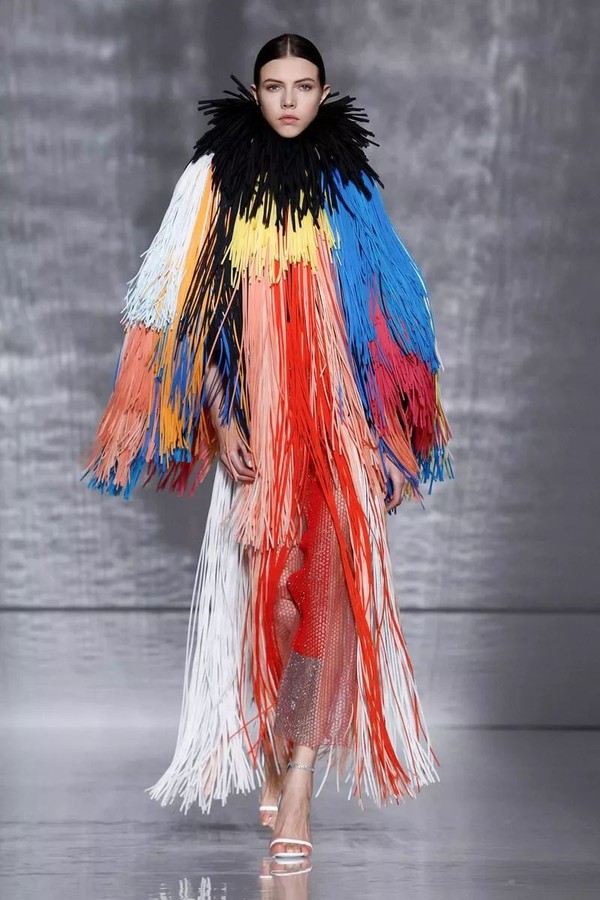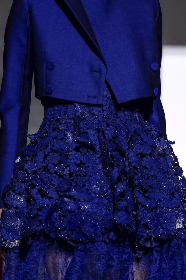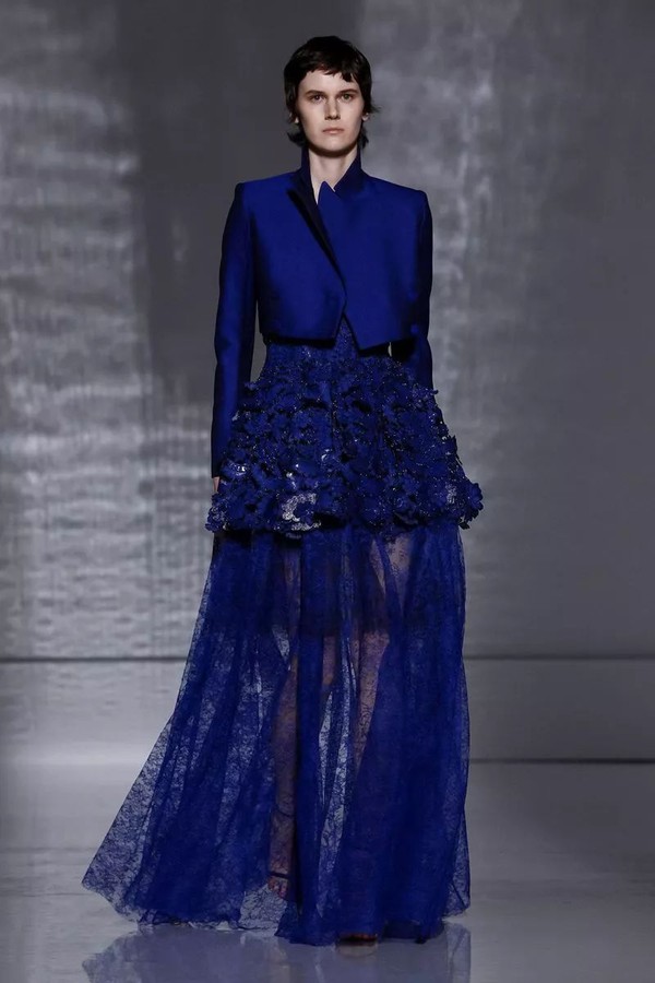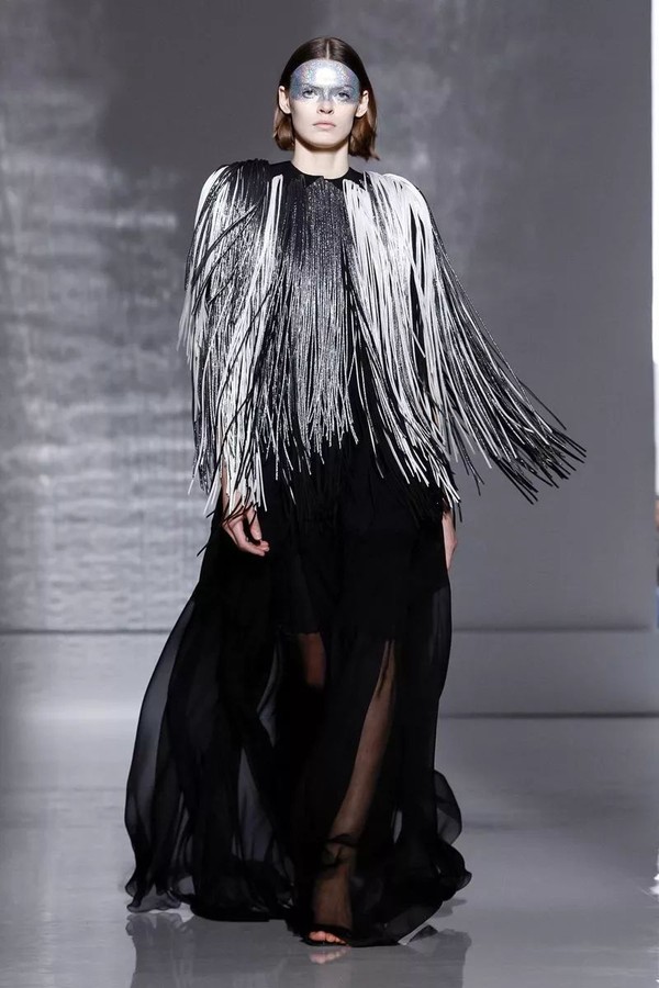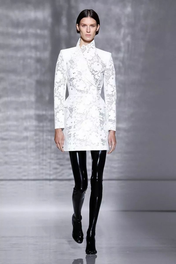 她的独特性就在于,即使轮廓和线条再过锋利,强势之余还依旧遗留着一丝柔情和浪漫情调,这是一种本能的体现,因为她一直都不是一位旁观者。西装外套之下是像瀑布一般的蕾丝裙装,那几件在脖颈绽放的流苏裙,就像是黑夜中绚烂的烟花。