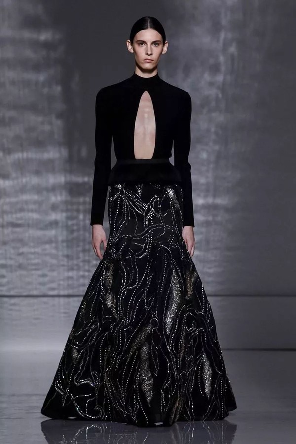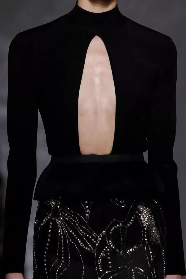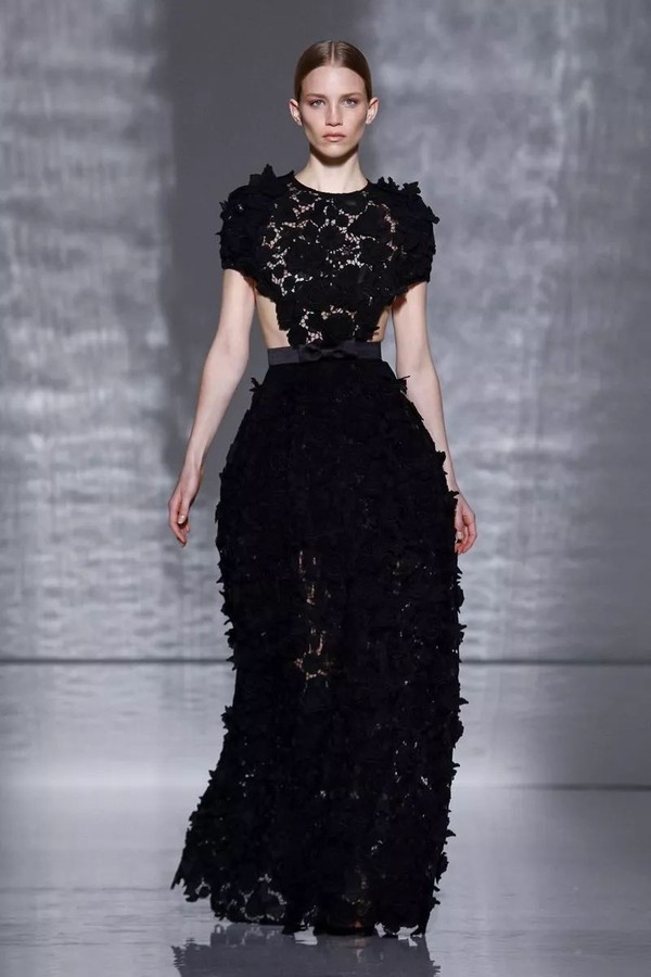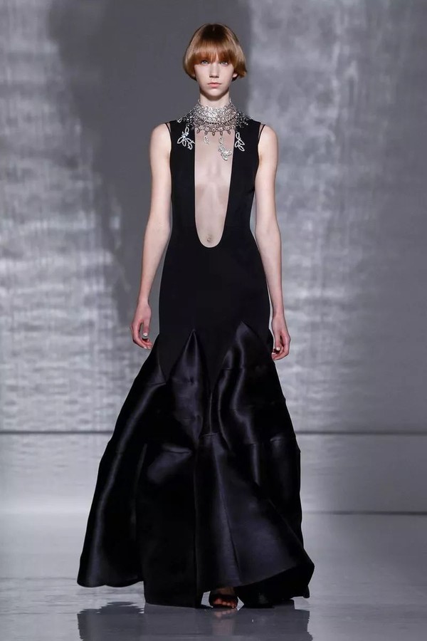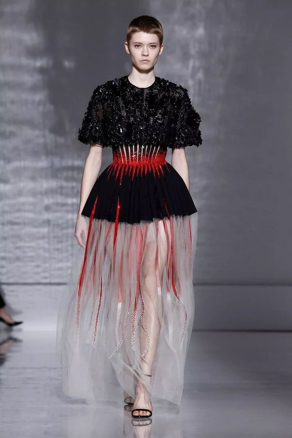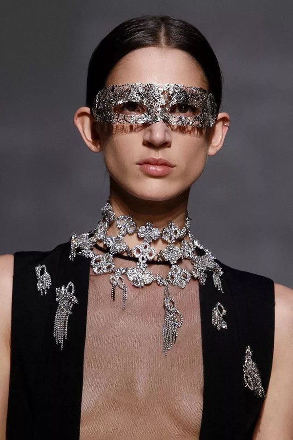 Givenchy的哥特气质从前任Riccardo Tisci时期就已经流淌在了其血液里,但Waight Keller的手法则显得更浪漫主义,镶满水晶的面纱与面具,以及她对黑色与皮革运用。还有那些从腰间倾泻的猩红色水晶,看起来就像屠杀之后的一滴滴鲜血。