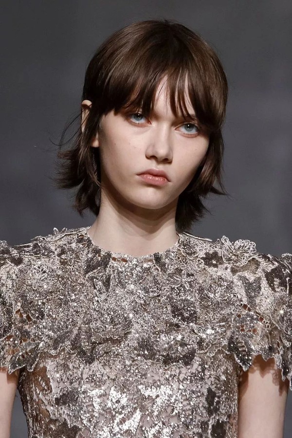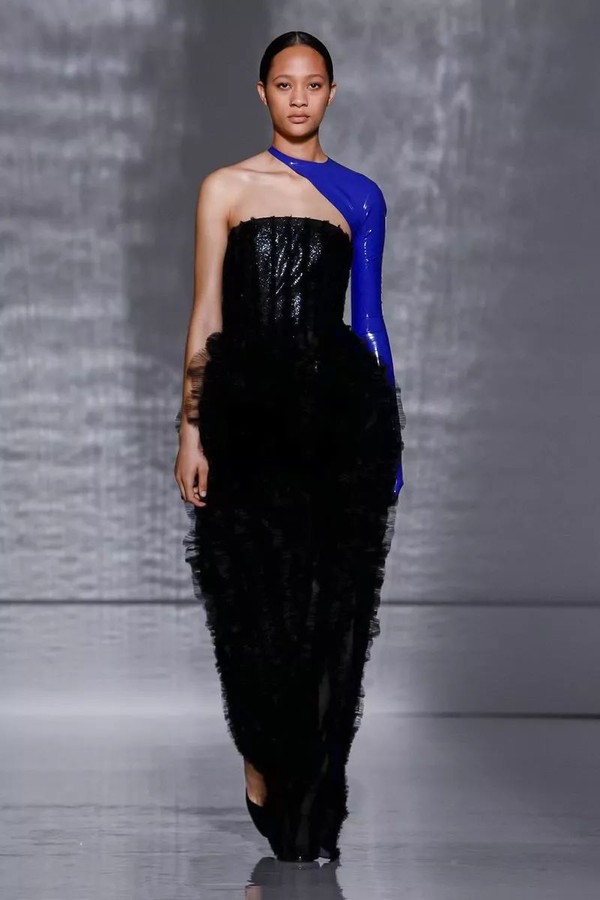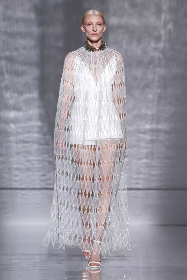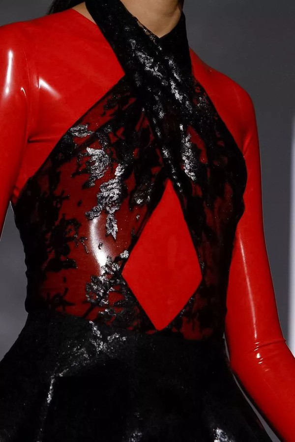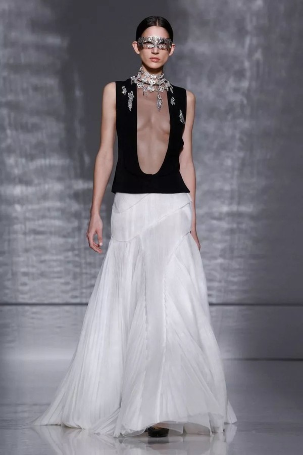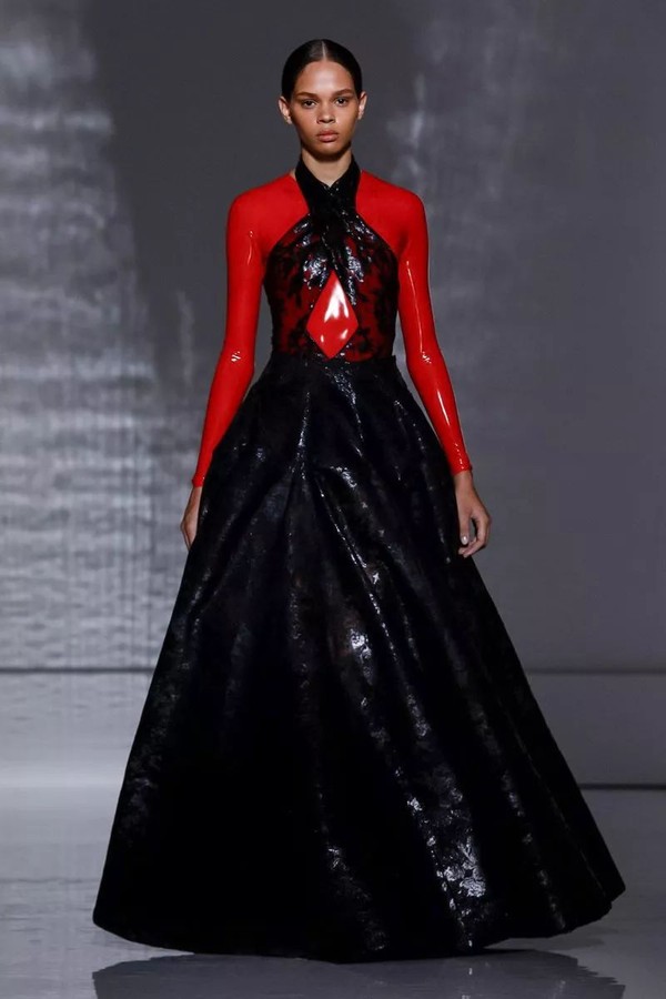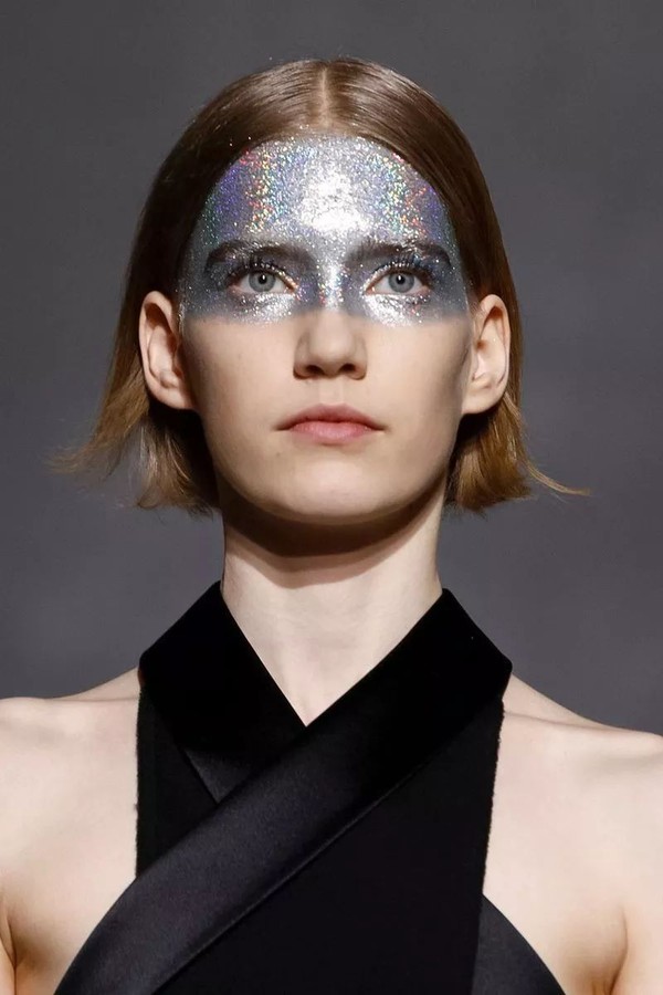 Givenchy的哥特气质从前任Riccardo Tisci时期就已经流淌在了其血液里,但Waight Keller的手法则显得更浪漫主义,镶满水晶的面纱与面具,以及她对黑色与皮革运用。还有那些从腰间倾泻的猩红色水晶,看起来就像屠杀之后的一滴滴鲜血。