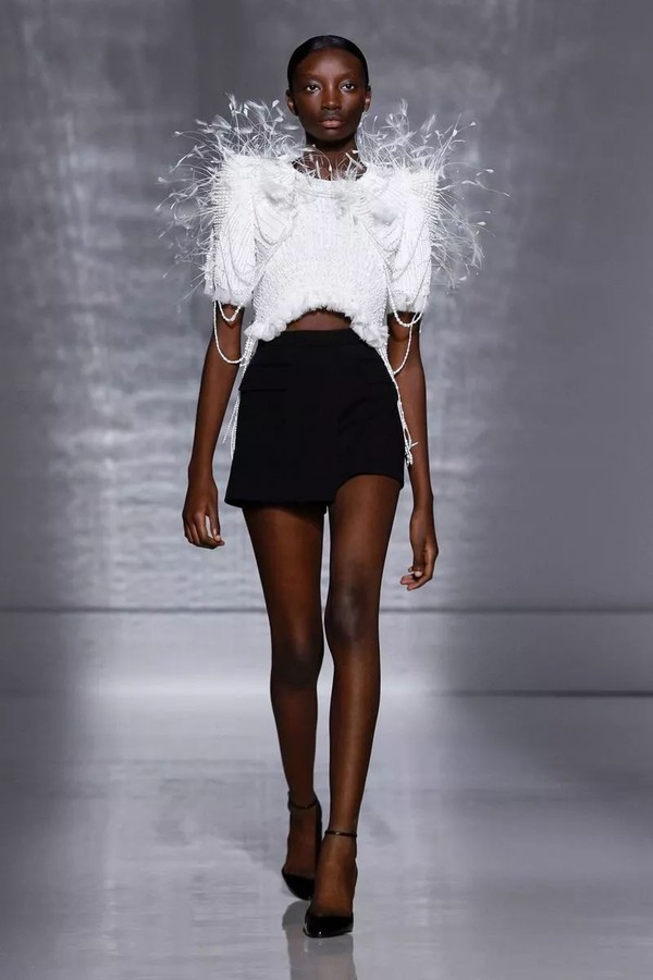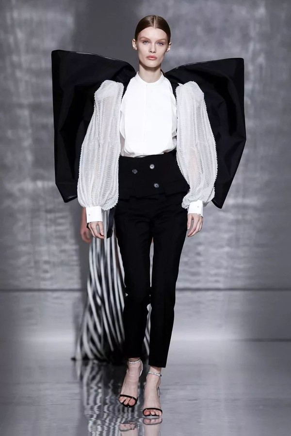 有趣的是,这场秀还有一个令人惊喜的彩蛋。在模特背着的巨大“翅膀”之后,其实是一个双肩包。高定双肩包,一个可爱的英式幽默。