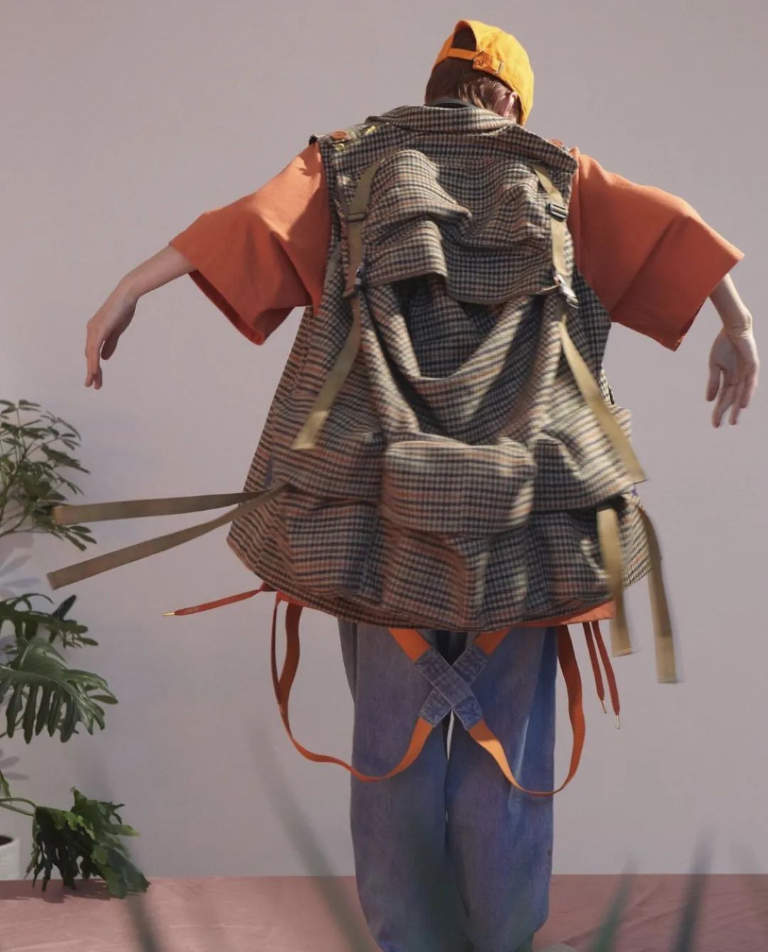 当然最关键的是品牌整体风格属于那种任意一件都是独一无二、特立独行的感觉,这件背带裤的款式设计就带有品牌标志性的交错复杂的结构设计特点,回收的面料质地又添加了一丝旧旧的复古味道。