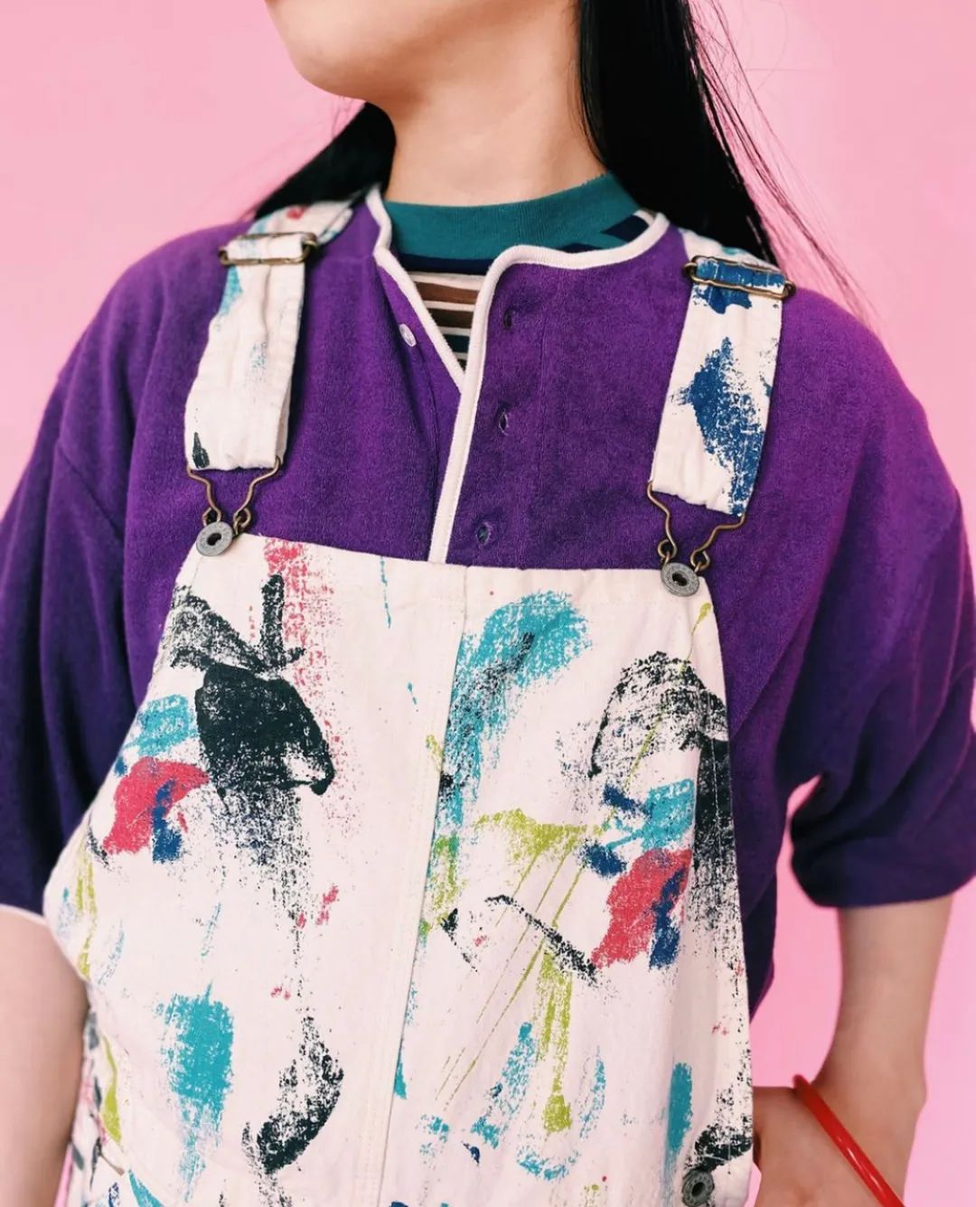 如何觉得Madness略微偏男装感,可以看看这件五颜六色的油画笔触填充的背带裤款式,还记得芭姐在前面说白色背带在以前一般是什么人穿的吗?如果再搭配一顶画童帽,妥妥的文艺女青年造型就get到啦。
