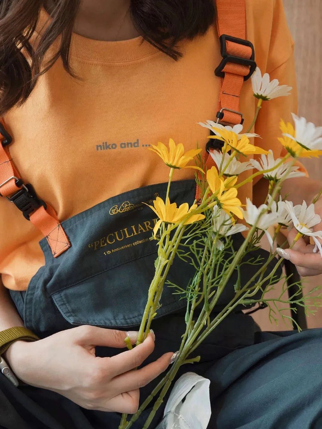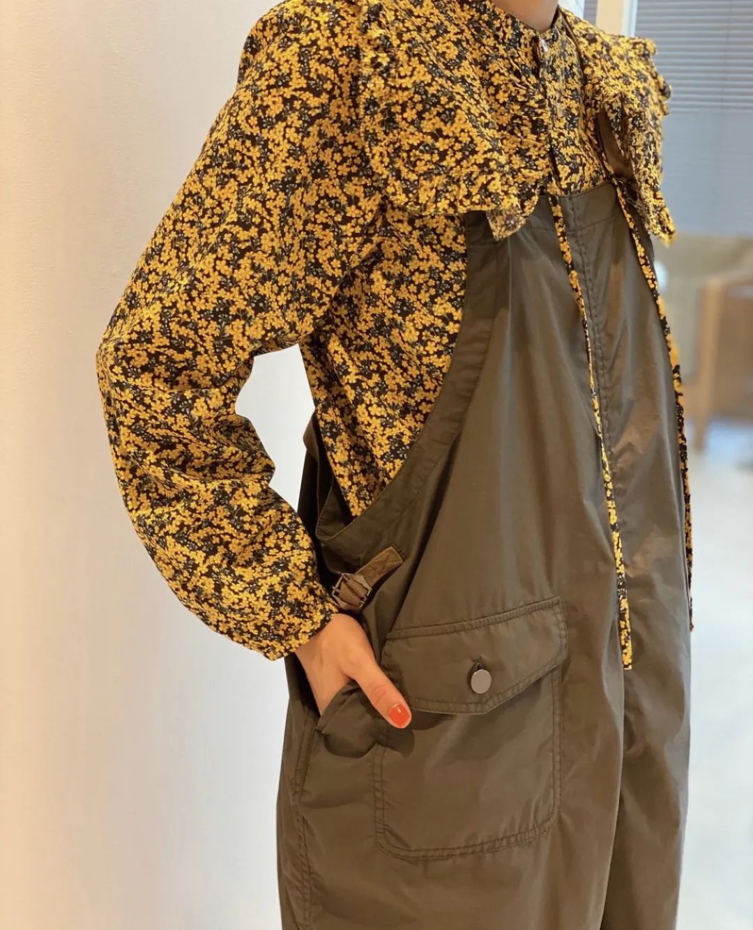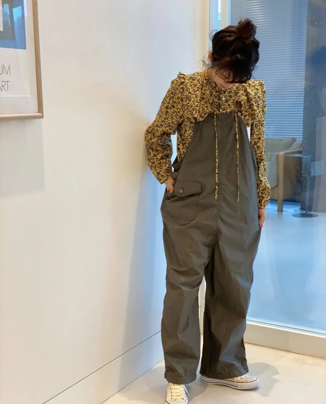 那么,同理可推如果搭配一件相近色系的小碎花上衣也不会感到奇怪了,再配上一双白色帆布鞋,第一次觉得中性风的背带裤竟然显得如此软萌可爱。