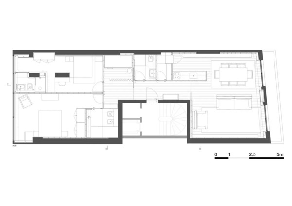 现有的空间包含一个宽敞的客厅,涵盖厨房区、两个套房、一个容纳双层床的壁龛、公共浴室和储藏室