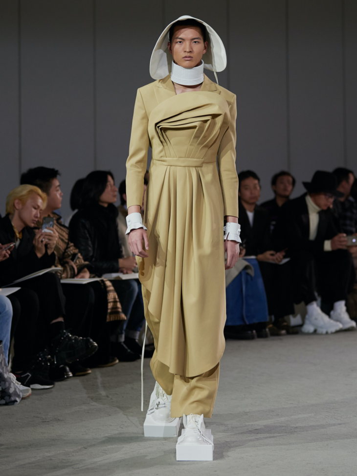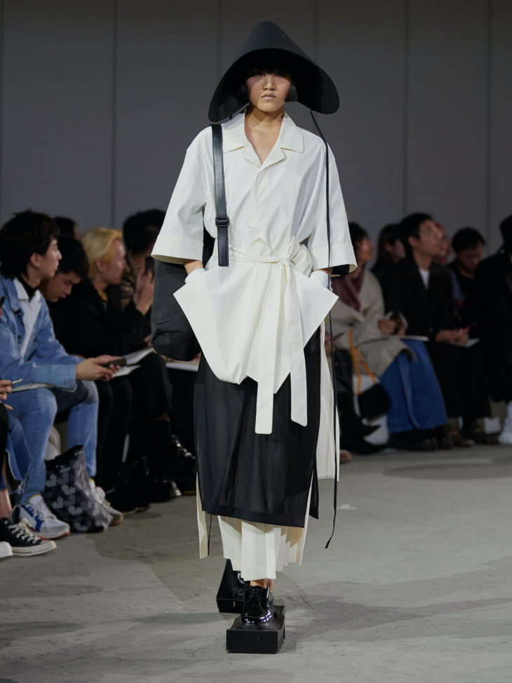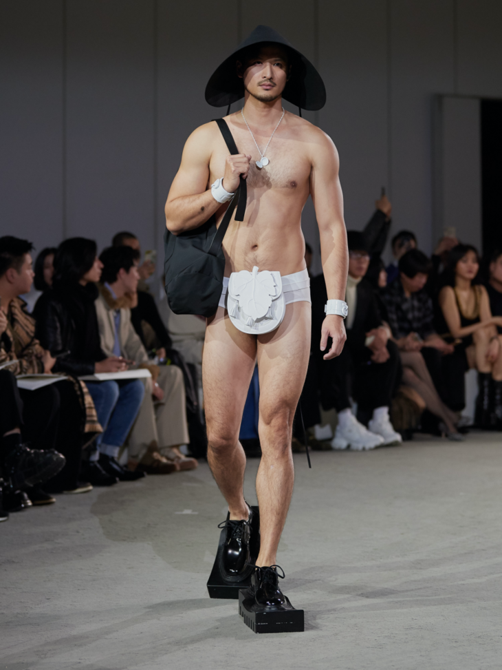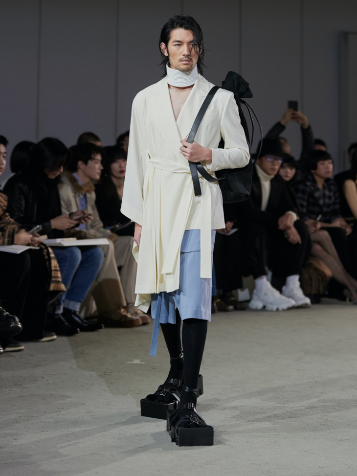 新系列采用大量的不对称设计和褶皱束缚细节凸显主题,无论是西装式剪裁的半领外套,还是带有祭祀感的半边连衣裙,亦或是树叶包裹形态下的廓形抽带夹克,它们既是对“破坏”的一种表达,也体现了反性别主义。用色上,层次丰富的大地色系与蓝色系贯穿整个春夏系列的主视觉,并点缀有MaISON SANS TITRE经典的灰粉和橄榄绿,使得整个系列更显轻盈雅致。而带有捆绑和修行概念的夸张鞋履;“无花果叶运动”的耳环与包袋;以及非洲长颈部落中逆人体自然生长意象的项链,带有丰富暗示与寓意的配饰使得整个系列在造型上与主题紧紧相扣。印花元素则来自日本当代艺术家野村浩平的作品《Kuchibiru》。