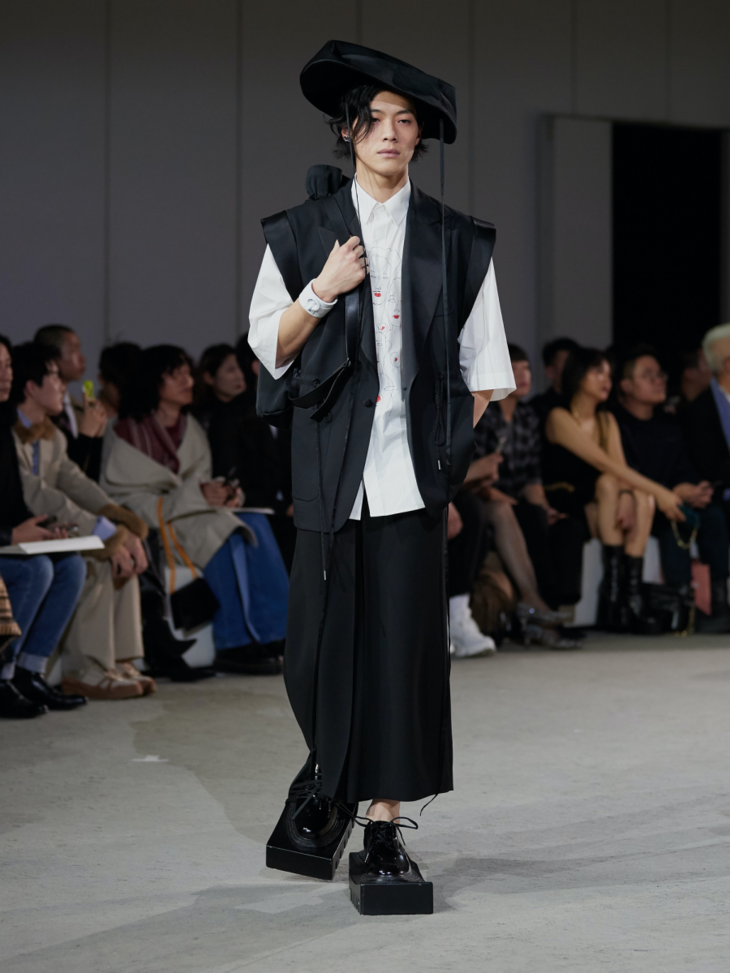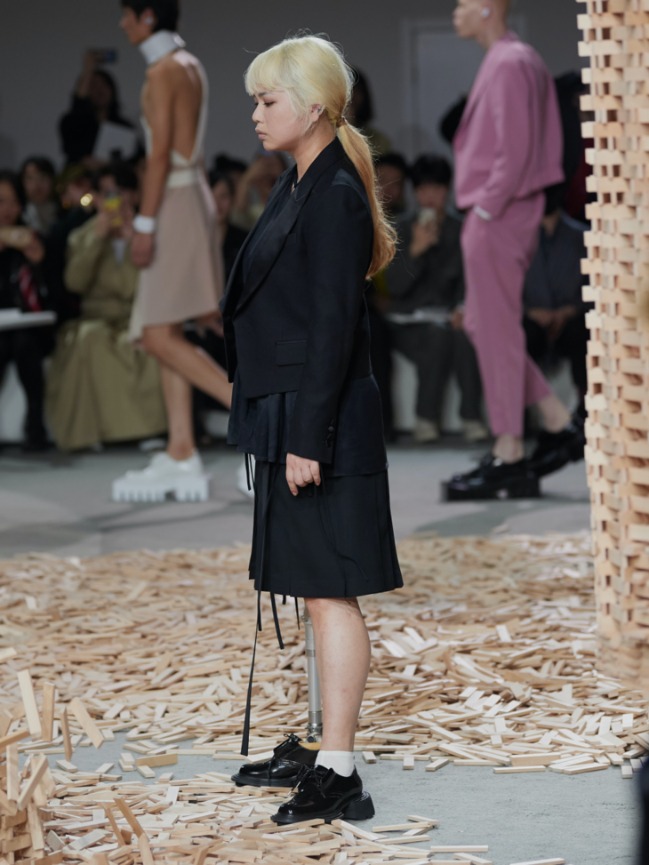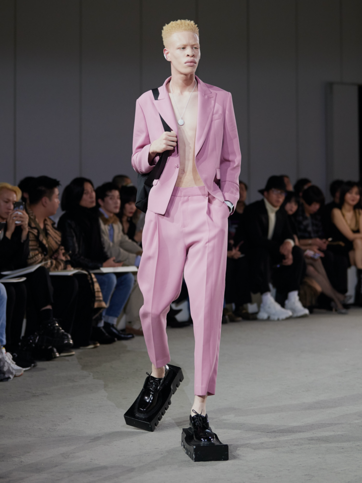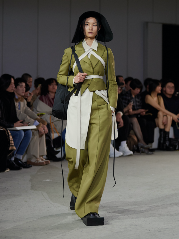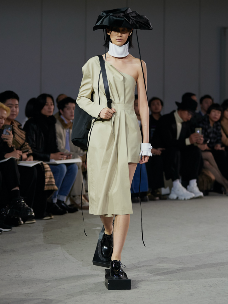 新系列采用大量的不对称设计和褶皱束缚细节凸显主题,无论是西装式剪裁的半领外套,还是带有祭祀感的半边连衣裙,亦或是树叶包裹形态下的廓形抽带夹克,它们既是对“破坏”的一种表达,也体现了反性别主义。用色上,层次丰富的大地色系与蓝色系贯穿整个春夏系列的主视觉,并点缀有MaISON SANS TITRE经典的灰粉和橄榄绿,使得整个系列更显轻盈雅致。而带有捆绑和修行概念的夸张鞋履;“无花果叶运动”的耳环与包袋;以及非洲长颈部落中逆人体自然生长意象的项链,带有丰富暗示与寓意的配饰使得整个系列在造型上与主题紧紧相扣。印花元素则来自日本当代艺术家野村浩平的作品《Kuchibiru》。
