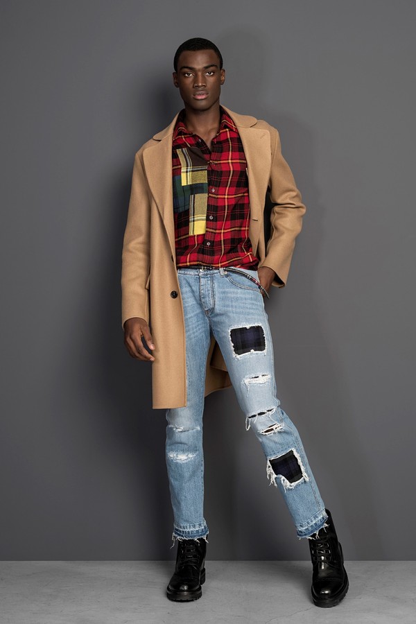 紧密契合本季主题,拼贴工艺在遵循标志性的苏格兰格子呢阴影效果的同时,与以深 蓝、红,绿、黄色为主的分层贴花工艺相交呼应。男人衣橱中的经典织物:千鸟格或 人字呢西装,被独具一格地打造实现了做旧效果。同时,凹凸感的雕饰令厚呢短大衣 和夹克也呈现出做旧后的整体质感。