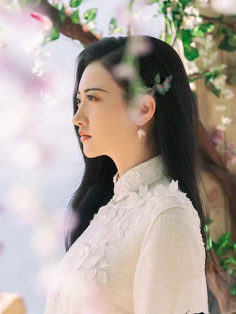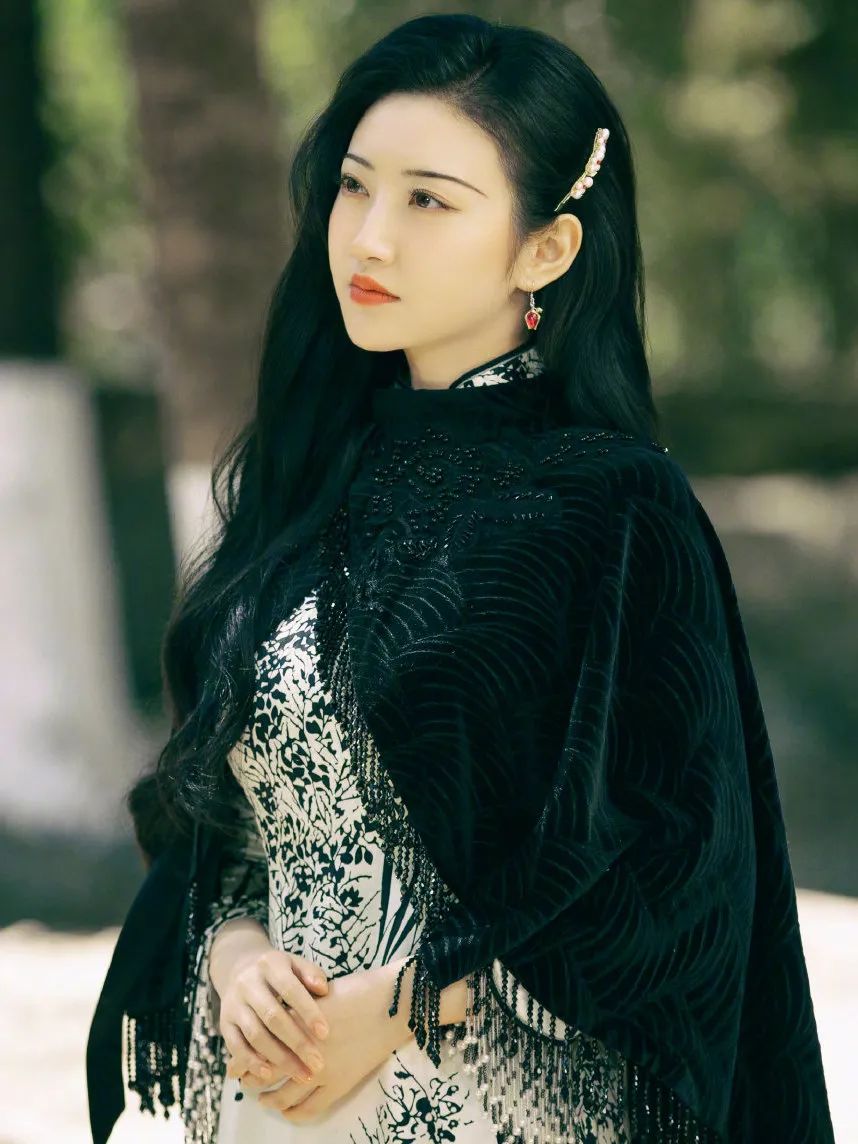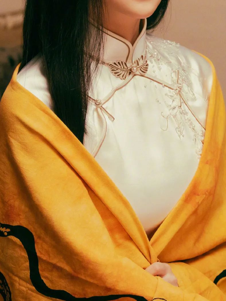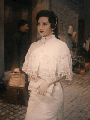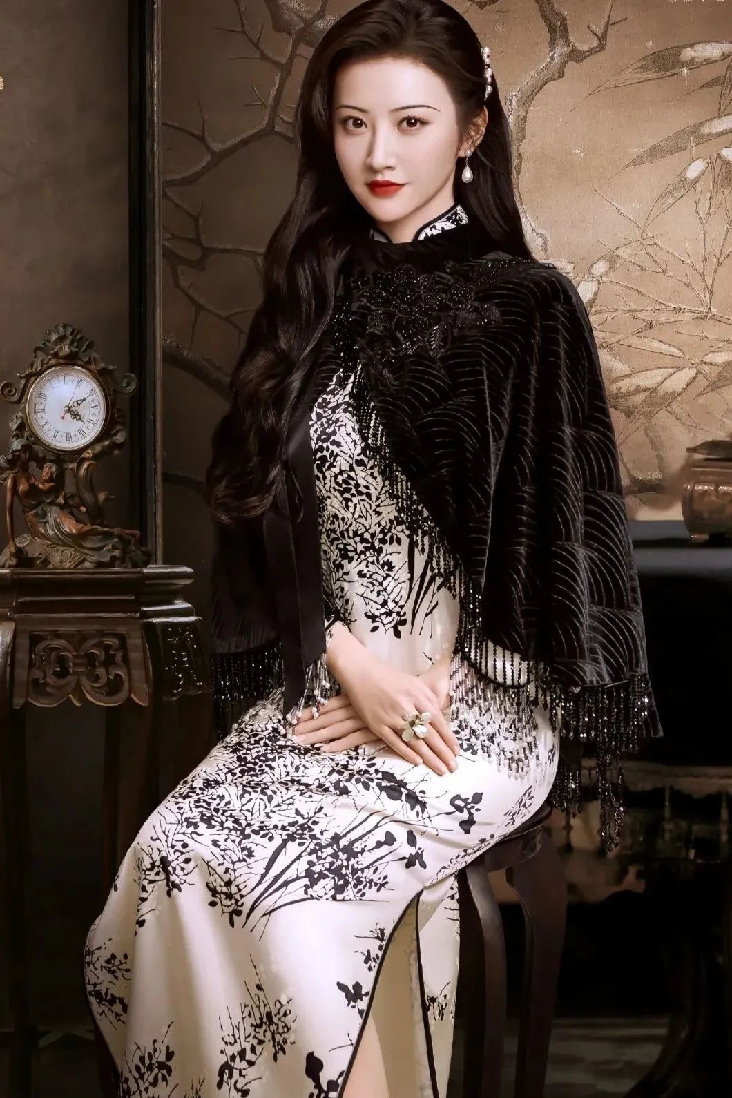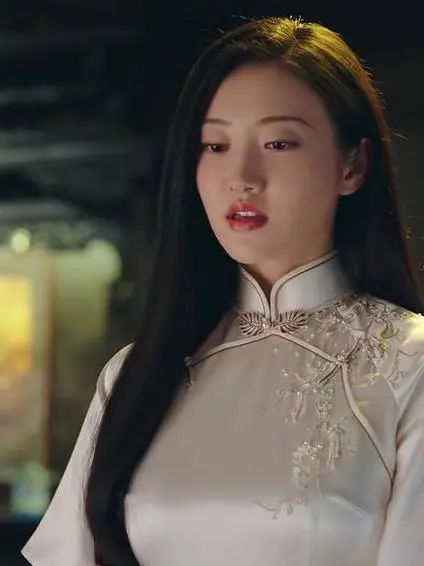 青墨黑的披肩与白底的藤花刺绣的旗袍彰显传统之美,配合读云卷的剧情需要,也是很应古墨生香的情景,内里的旗袍样式仿于近代旗袍,修身剪裁,侧面开衩,同样是影视剧中常见的旗袍款式。