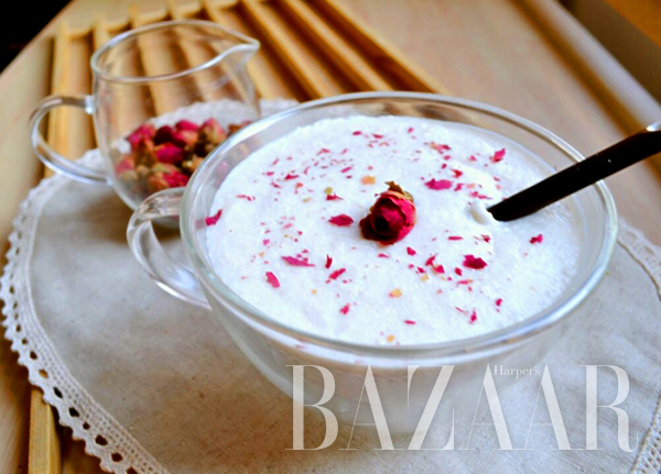 1.将糯米和花生泡一夜,放入料理机,倒入椰浆,牛奶和香草精,洒入玫瑰花瓣,开始搅拌30--50秒,用滤网滤掉渣。