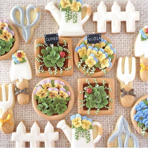 比如这个“园艺”主题曲奇,不仅有多肉形状的曲奇,还有种植需要的剪刀,铲子,锄头和洒水壶,连花园需要的栅栏都有!