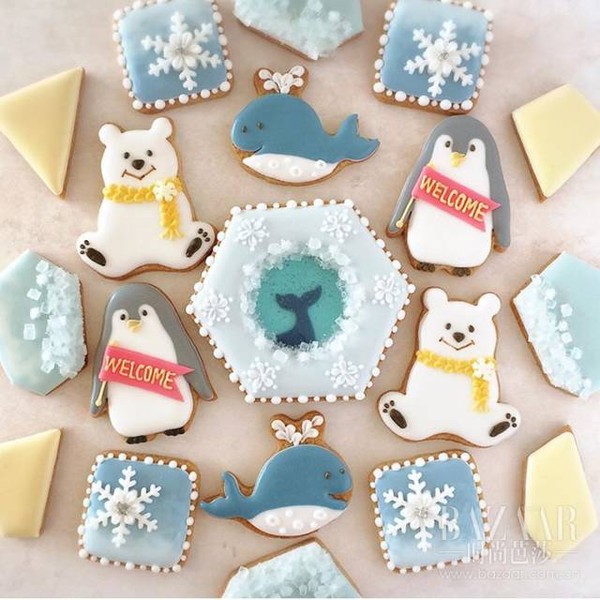 “海洋”主题曲奇也同样丰富多彩,有些呆萌的北极熊,微笑的海豚,还有拿着“欢迎”小旗的企鹅,个个都要萌化了~