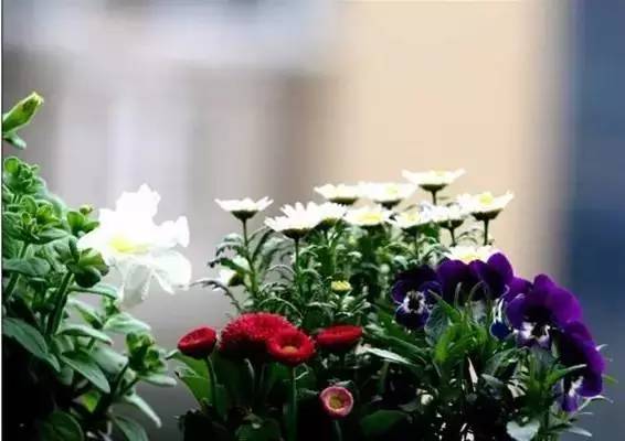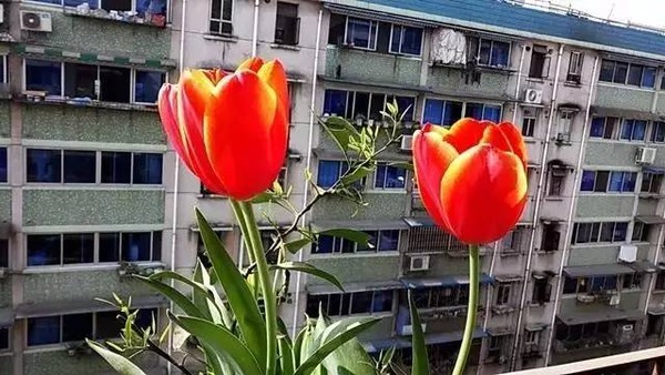 同样的原理,在天台或者相对开阔的阳台上,砌出一长条花坛出来,让亭亭的郁金香与低矮的草花们同框,加上色彩的互相映衬,极漂亮!