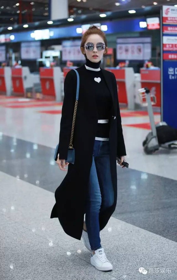 除了丸子头,芭姐还特别喜欢娜扎毛衣上的心形图案,不光让一身造型有了亮点,还跟白色鞋子相互呼应。虽然全身只有黑白蓝三种颜色,但有了趣味图案就能看起来一点也不单调
