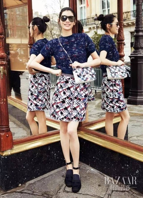 奚梦瑶最近拍写真分分钟秒杀菲林,针织T恤是长颈细腰的仙女才能驾驭得了的,红蓝交织的几何印花半身裙和同花色的手袋融为一体,般配得毫不眼花缭乱。这只Chanel春夏款的链条包,芭姐真的认为可以从春天一直背到冬天。