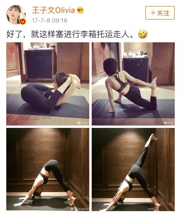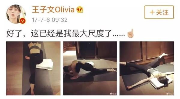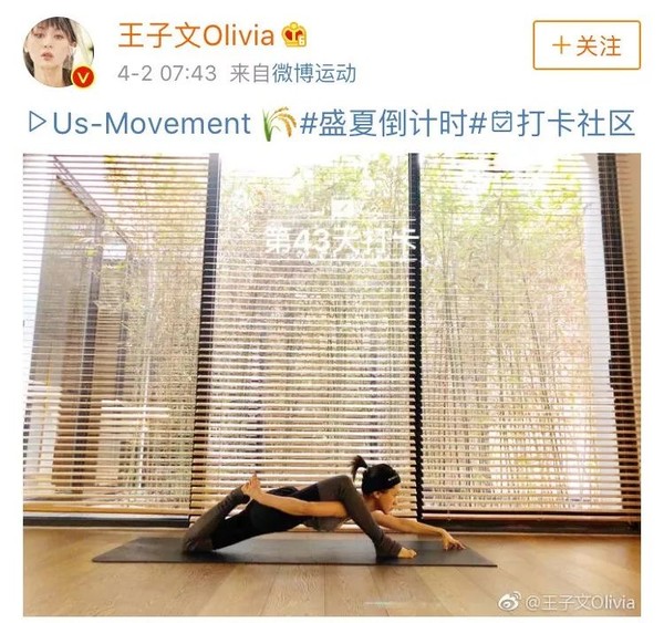 而有7年瑜伽经验的王子文小姐姐,悄悄在微博上进行了43次的瑜伽打卡!专业程度可以说是瑜伽博主本人了