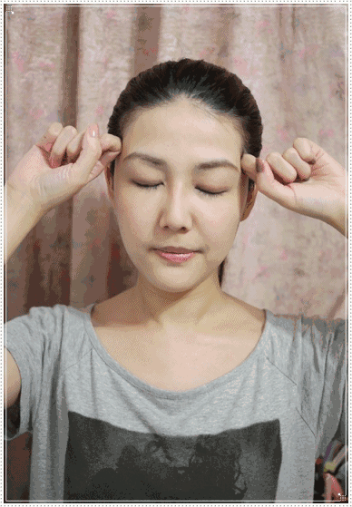 接着,从太阳穴开始,用食指沿脸廓向下按摩,放松脸部肌肉。