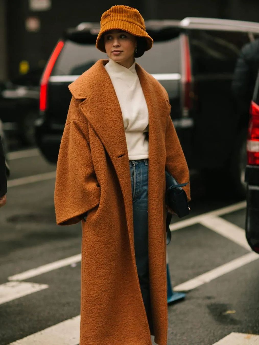 最后再来说说经常被忽略的面料细节。超长大衣的面料越硬挺、垂坠感越好,便越能有纵向的延伸感,在视觉上也能更显高。相反,如果大衣的面料选得不好,感觉比较蓬,便会让衣服看上去很宽大,这样整体就很容易压个子了。所以,挑选超长大衣时也要避免有膨胀感的材质,选择垂坠感更好的面料,这样穿上身妥帖又垂顺,人看起来自然高了很多。