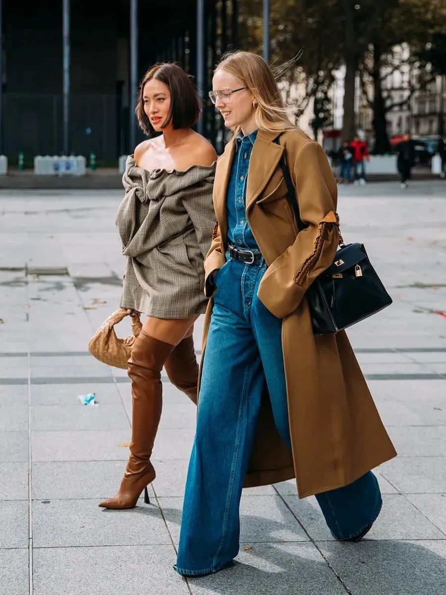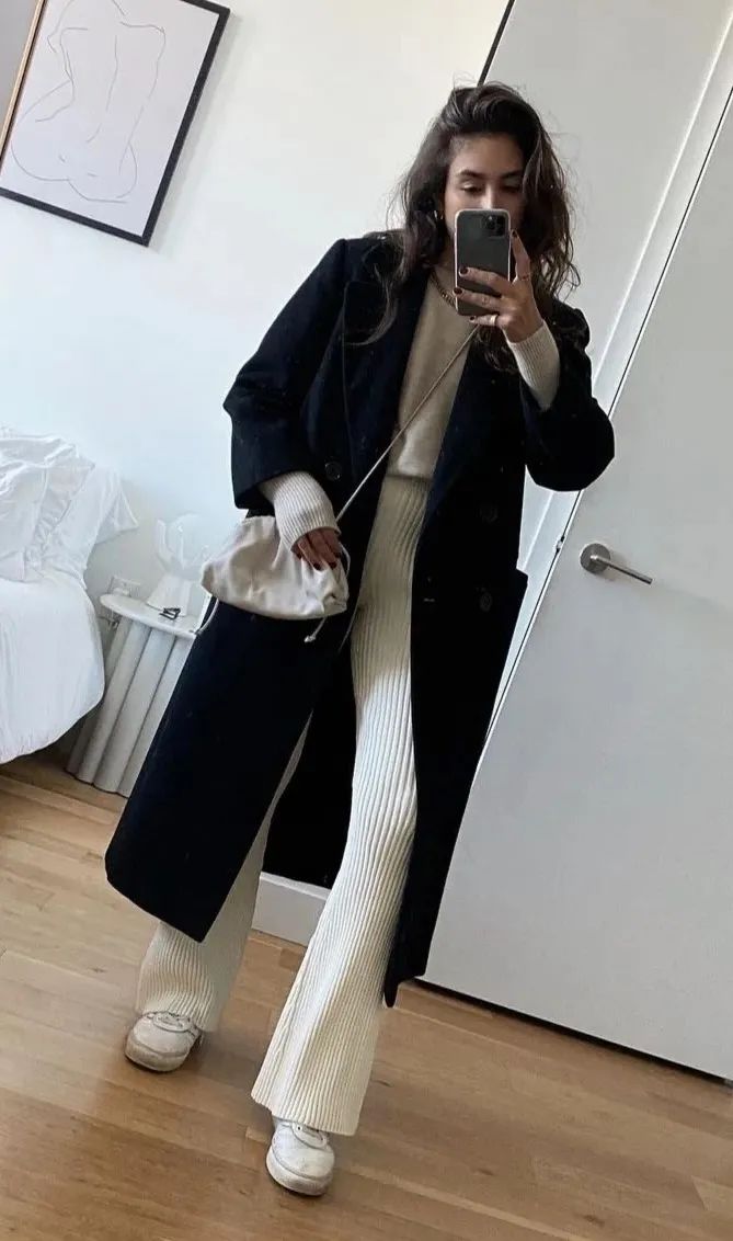 超长大衣和阔腿裤搭配还有一个穿搭的关键,阔腿裤尽量要选高腰款式,并且记得把大衣敞开来穿,这样才能最大程度突显腰线显腿长。