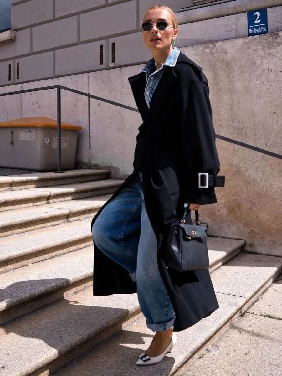 超长大衣+牛仔裤超长大衣还很适合搭配休闲随性的牛仔裤。牛仔材质的不羁和洒脱可以打破大衣的正式和成熟,让整体穿搭多了一丝街头的活力感。不管什么颜色的超长大衣,和牛仔裤搭配起来都很和谐,这种基础万能 Look 不管上班、出街都无压力~
