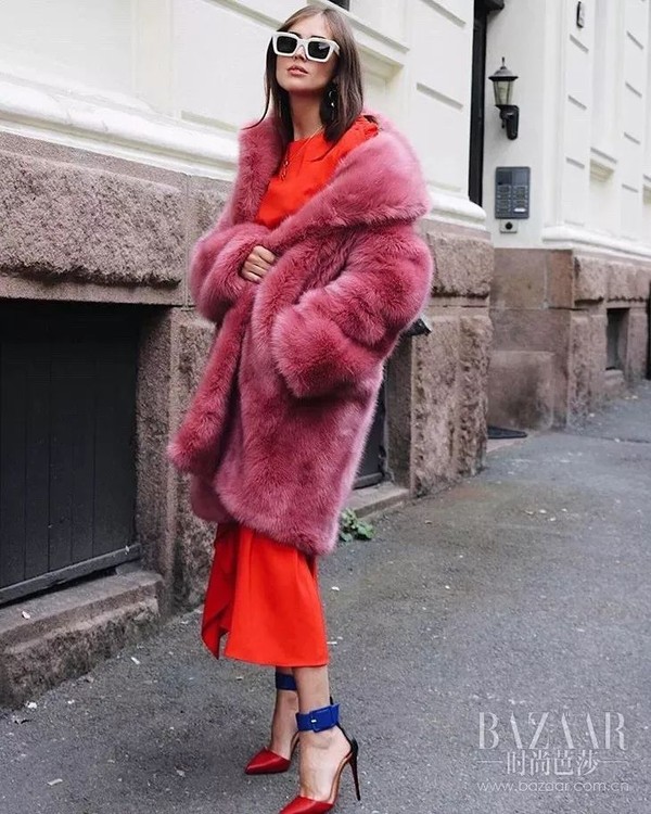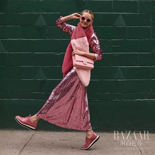 Tip 2.利用不同材质的粉色给造型带来更多可能性。粉色亮片连衣裙太过抢眼,一条粉色毛绒围巾削弱造型的强势感,就不会太 Over,时髦得依然毫不费力。
