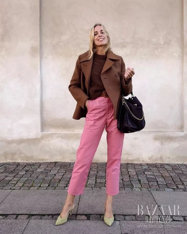 棕色是搭配粉色的安全色里比较特殊的颜色,因为它不属于无色彩颜色,中和效果没那么强,所以它基本是要要遵循“冷棕配冷粉,暖棕配暖粉”法则,像博主穿的就是暖棕与暖粉。
