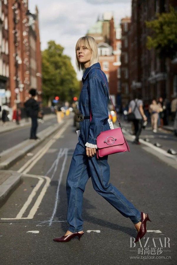 深蓝牛仔色搭配小面积的枚粉,有一丝跳脱感,画面色彩却不失衡,轻松 get 时髦感。