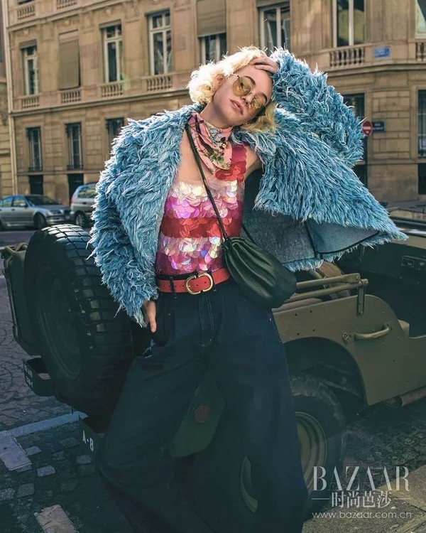 一旦换个材质,就能尽显这组粉蓝 CP 的鬼马精灵。毛毛材质的蓝色大衣内搭粉色拼接亮片吊带,趣致十足,时髦得与众不同。