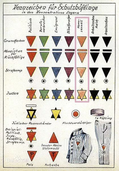 在歧视相当严重的希特勒统治时期,纳粹集中营中被判有罪的同性恋者被迫穿印有粉色三角形标志的囚服,后来同性恋平权主义者将粉色三角形稍加修改,成为他们的标志。