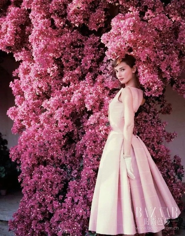 赫本的小黑裙造型出名,但粉色造型同样深入人心,相较之下,她会说她相信粉红色。相信它的华丽,也相信它华丽背后的坚毅,她在无形中将粉色带往俏丽动人的形象。