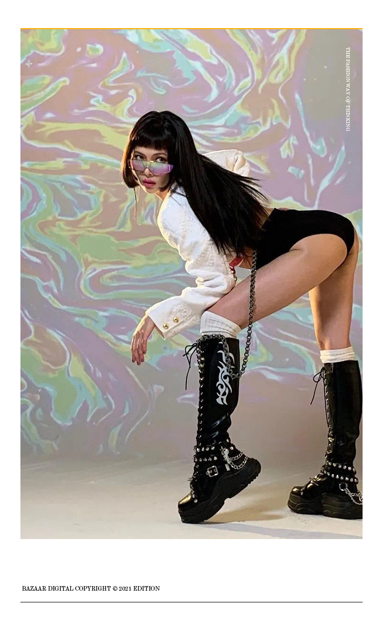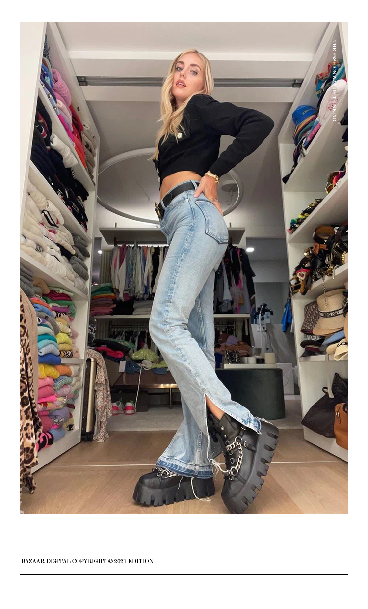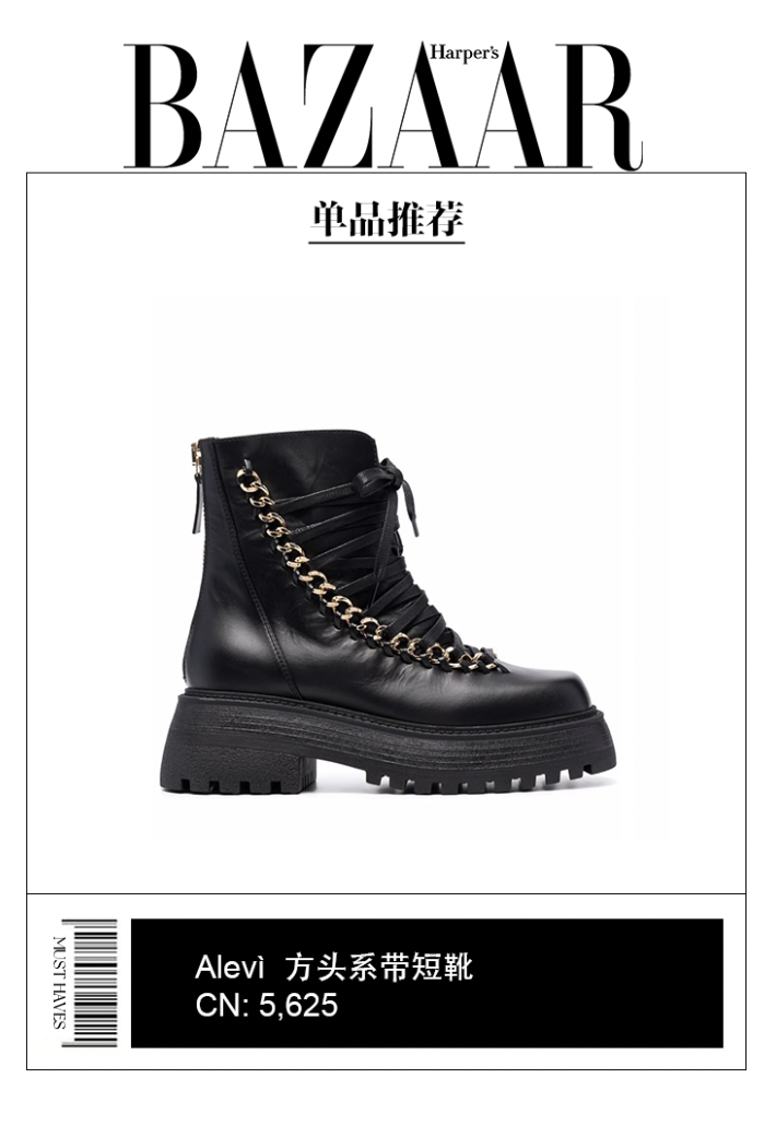 说了那么多,芭姐总觉得还差那么点感觉,还不够有个性,不够紧跟潮流。那你一定得选一双厚底靴配金属链条,紧跟最流行的Y2K千禧风。