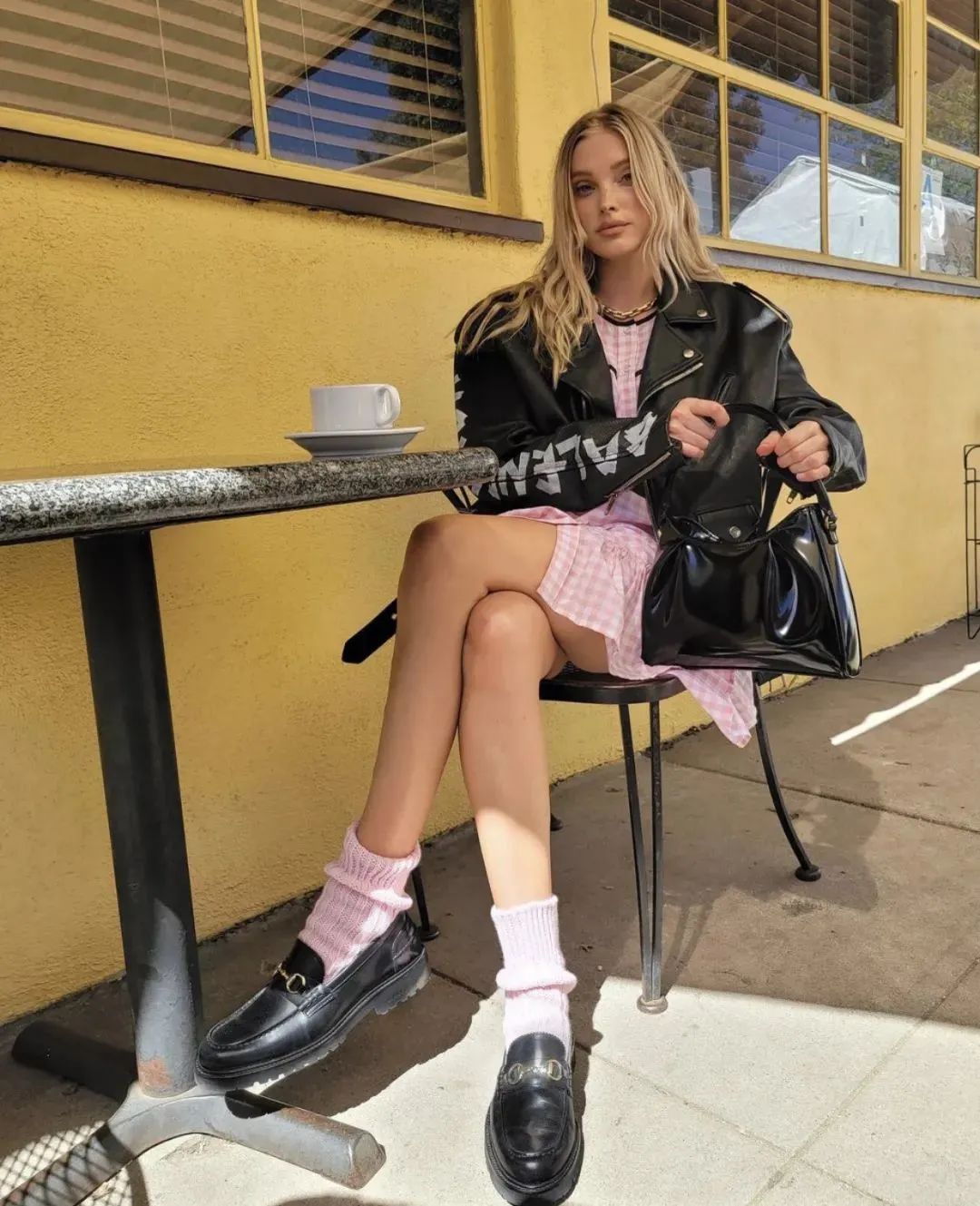 要想给乐福鞋来点趣味,加点不一样的。还得看臭脸博主Reese,她选的乐福鞋上面烫金质地的手指图案,比起前面的要更有趣得多。