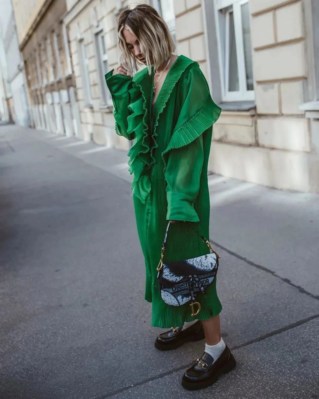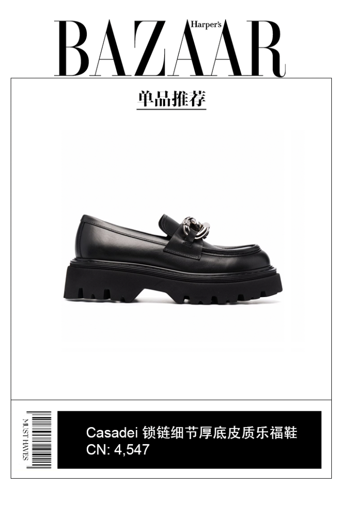 #乐福鞋+金属元素复 古 英 伦 的 女 学 生说到乐福鞋,Prada家的这双爆款已经被各路明星带货,今年的秋冬爆款鞋排行中,它称第二,就没谁敢称第一。