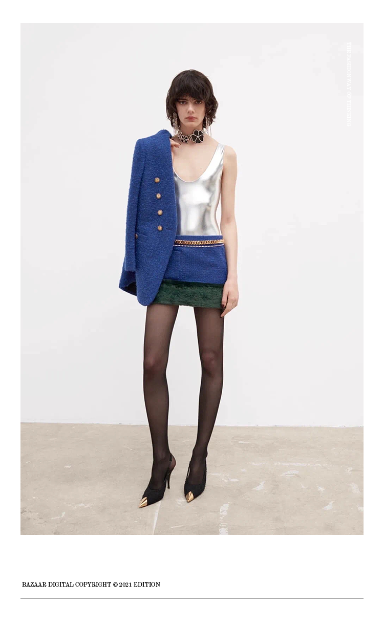 继之前大金链子的爆火,金属元素又开始对鞋子下手了,再简单的小黑裙,只要穿上一双带有金属脚链的高跟鞋搭上其他配饰,从头到脚都在发光就不是梦。