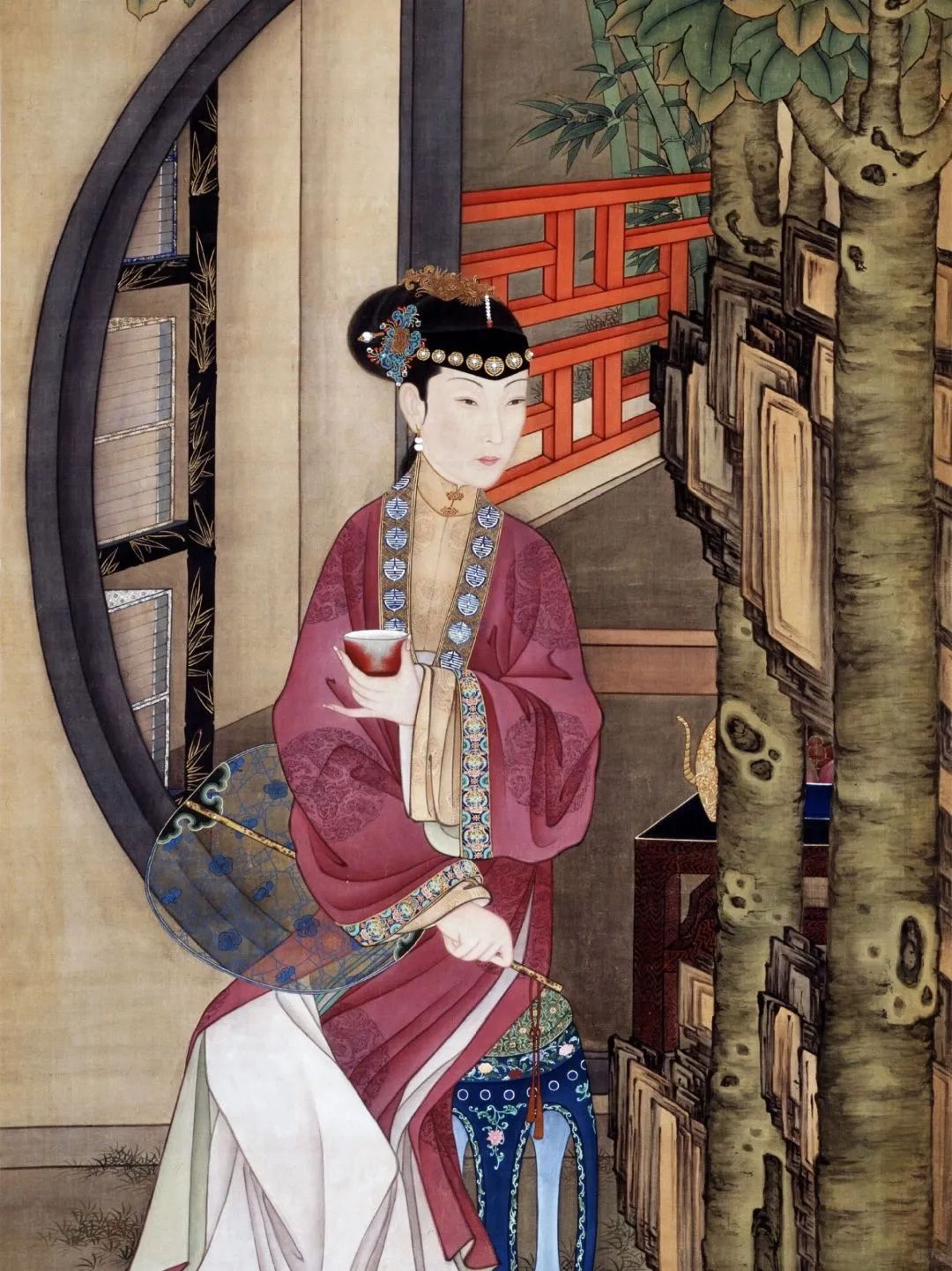 从左到右依次为:清 陈枚《月曼清游图册》之碧池采莲 故宫博物院藏、清 《雍正十二美人图》故宫博物院藏、明 唐寅 班姬团扇图 台北故宫博物院藏