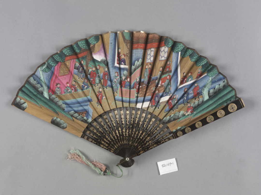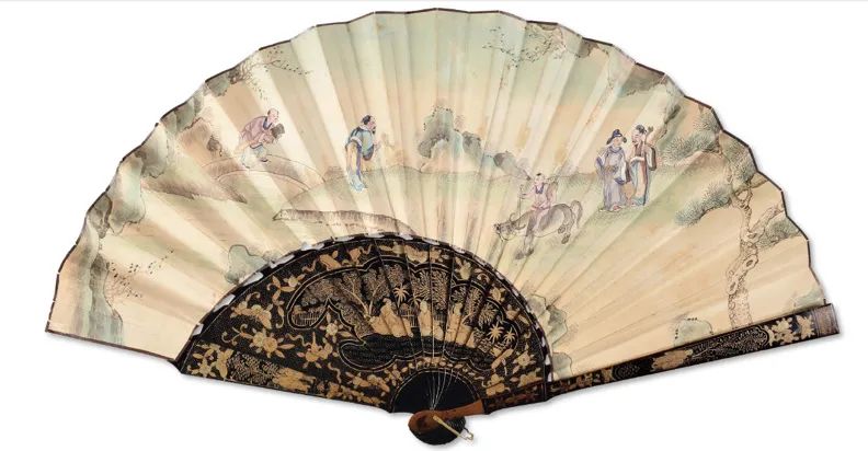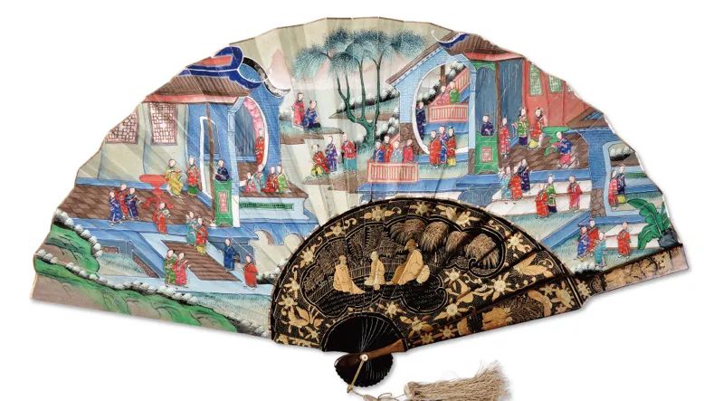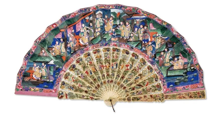 在十七、十八世纪,来自中国的这扇香风,乘着广州十三行的商船飘洋过海,扇动起一阵风靡欧洲上流社会的中国风(chinoiserie),这些远洋海外的折扇被统称为“外销扇”,在国内较多馆藏于广东省博物馆、广州十三行博物馆,流在海外和私人收藏的更是居多。