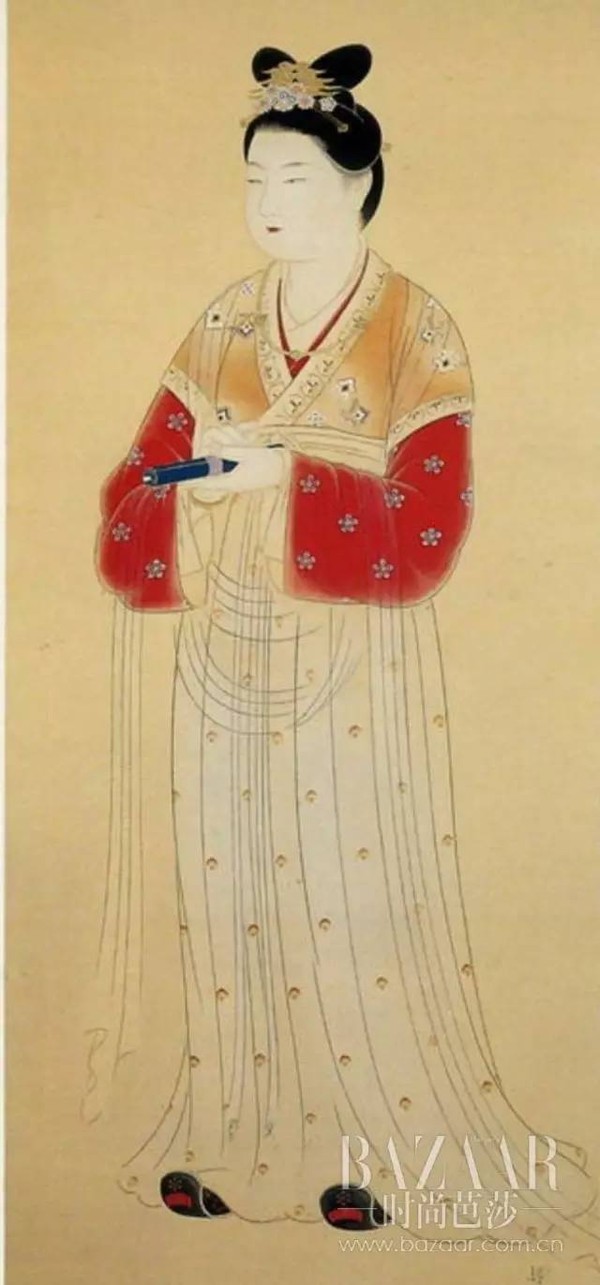 1944年菊田契月参考了一些唐代资料所画的他想象中穿唐朝服装的光明皇后相比于日本,从服装的变化上,唐朝的服饰远比和服要活跃得多。唐高祖建立唐朝的时候,女性依然保持着隋代后期的服饰,穿小袖衫子,裙腰高高的扎在腋下的位置,梳着像帽子一样覆盖在头上的盘发。但到了唐太宗时代,女性平常的发髻要简单的多,通常是头顶的小髻;贵妇在比较正式的场合,会戴高大的假髻;半袖上衣开始流行,搭配小袖衫子,和帔子一起形成一种新式的面貌。