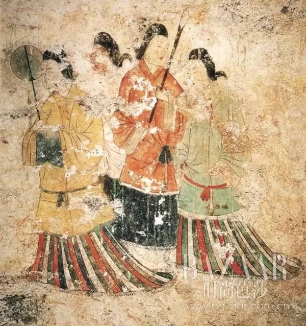 段简壁墓壁画,穿条纹裙子,头戴假髻的女子